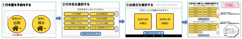乗車の30分前までにタブレットで予約することで、利用可能です。電子決済の導入も可能。
